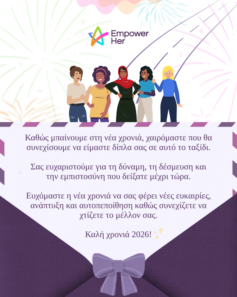 Καθώς μπαίνουμε σε αυτή τη νέα χρονιά, το EmpowerHer θέλει να συνεχίσει να σας συνοδεύει στο ταξίδι σας προς την ανάπτυξη, την αυτοπεποίθηση και την ενδυνάμωση.
